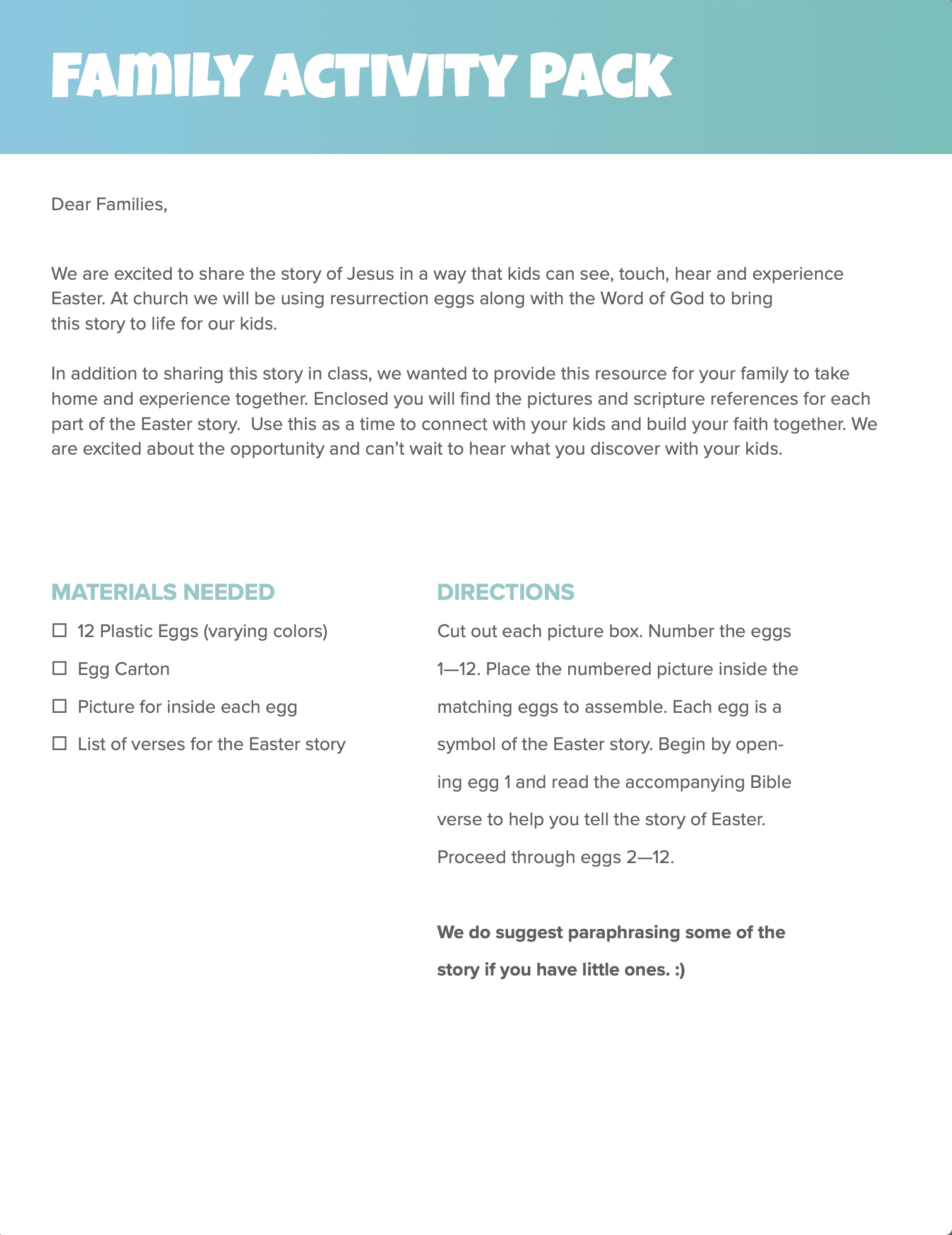 Send your families home with their own set of scriptures and Easter Egg inserts so they can experience the Easter story together.
