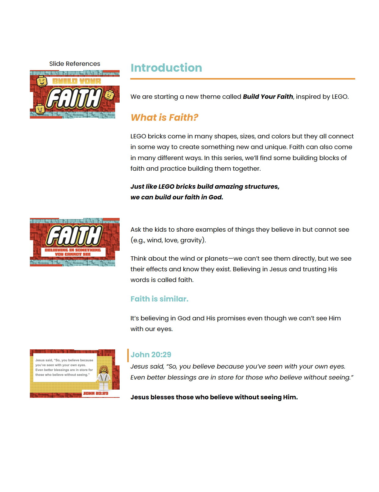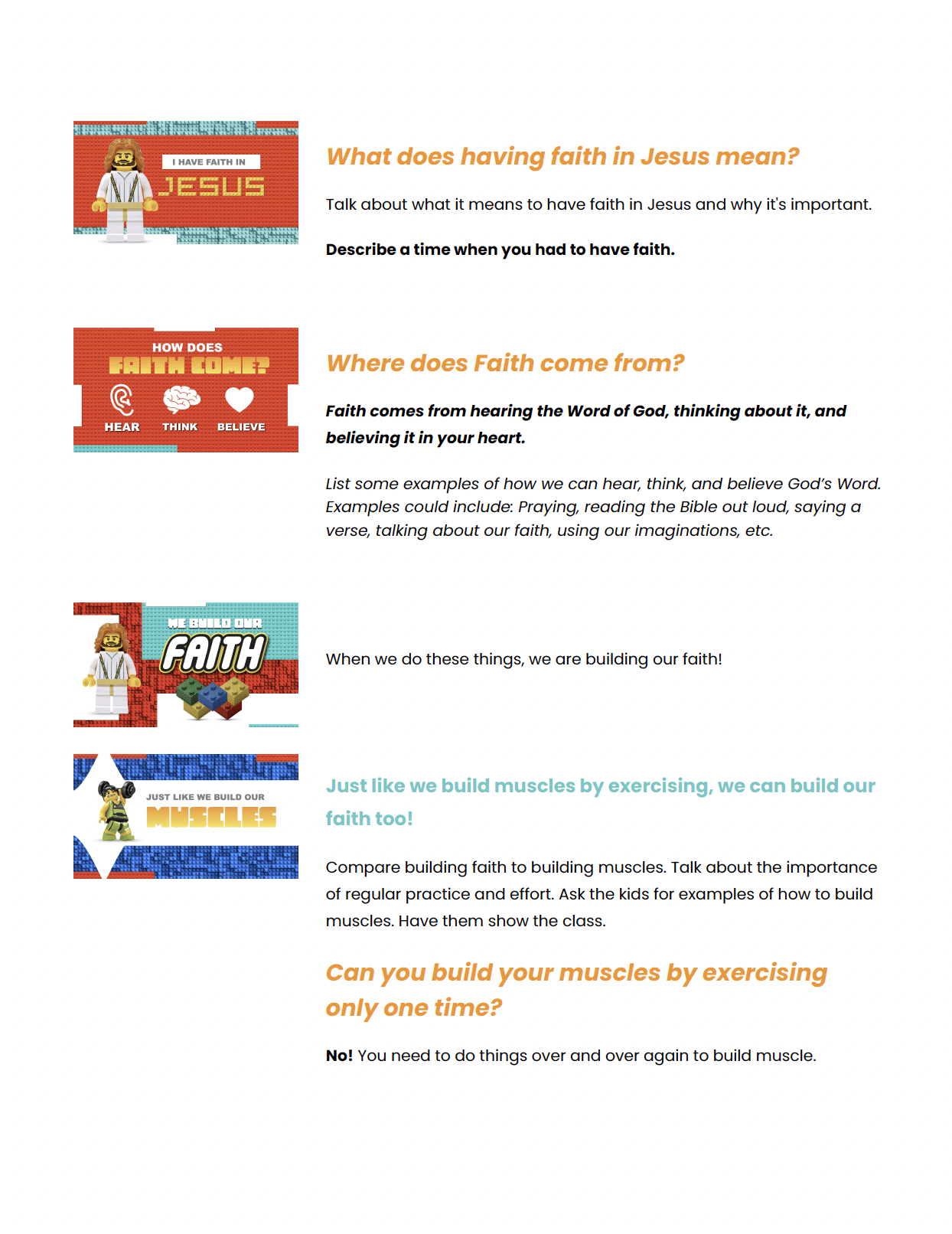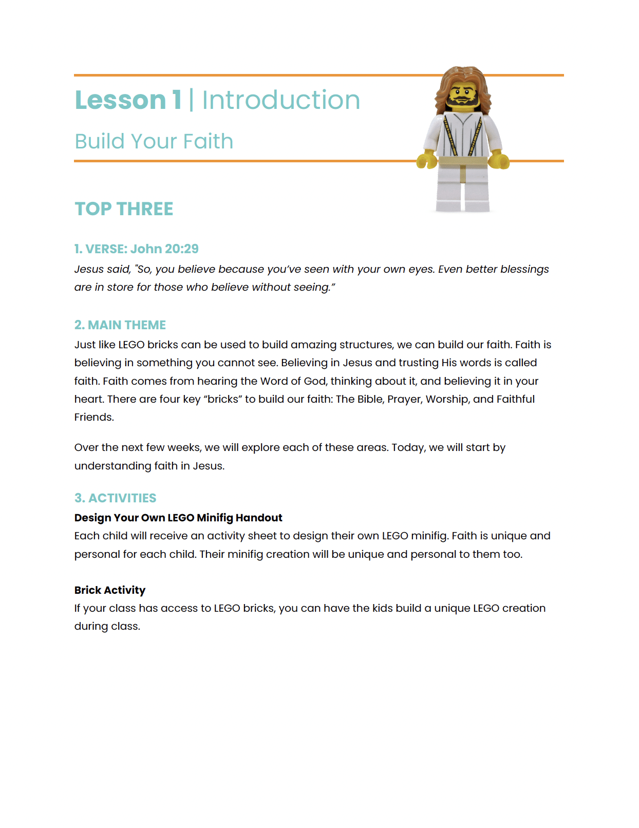 Everyone loves building with bricks! In this Lego-themed lesson pack, the kids will learn even their small actions can build a BIG faith. We’ll talk about the importance of God’s Word, prayer, the Holy Spirit, having faith-filled friends, and more. We’ve also included many activities and a short video series called LEGO LAB. Let’s get brickin’ and build our faith together!