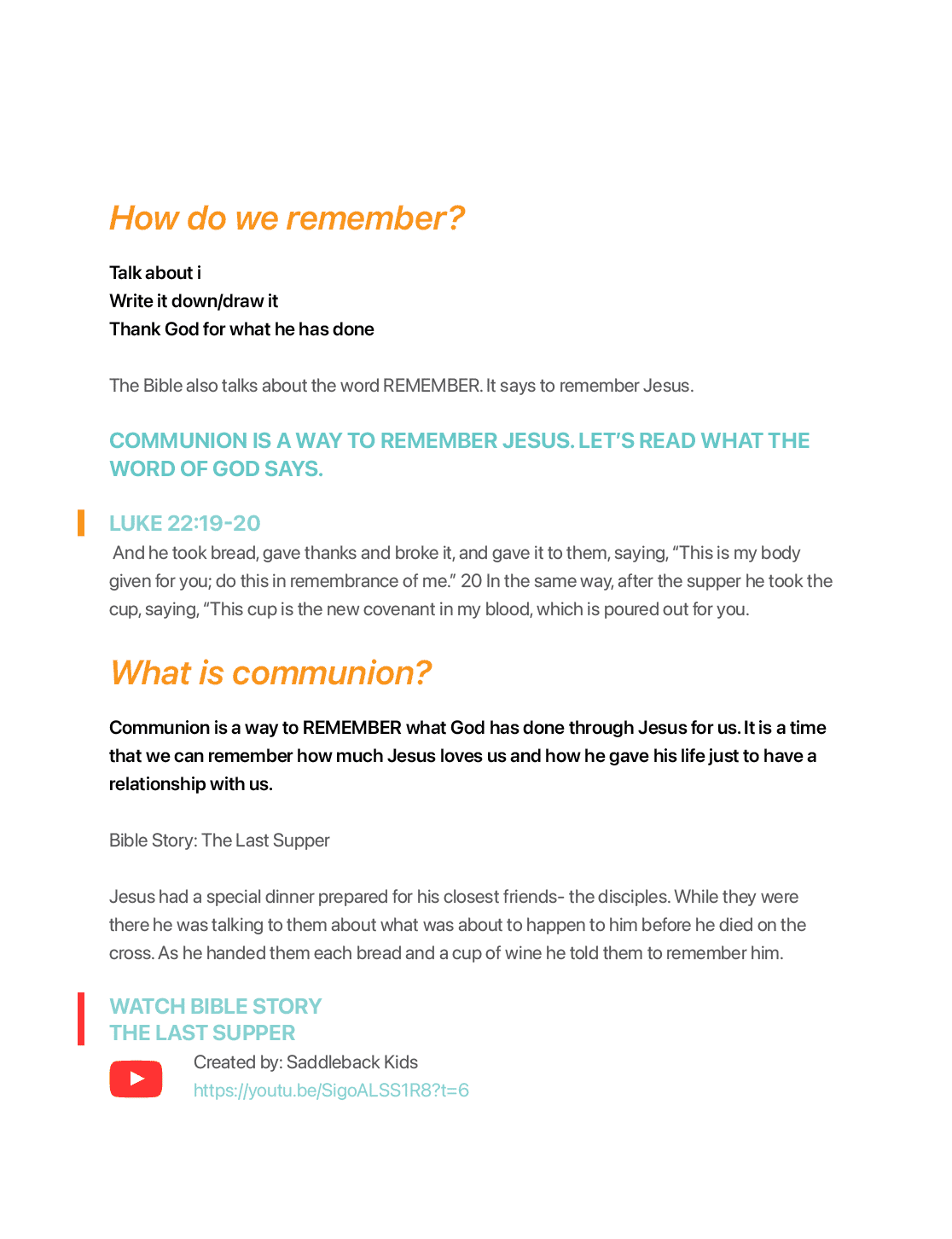 When we remember what God has done for us in the past, it sets our expectations for what he can do in the days, weeks, and months ahead. In this lesson, we take time to think about some of the great things that have happened this past year. We talk about them and even write them down. It's a good thing to put all of those things in our minds because it helps us to be thankful. Most of all, we take time to remember Jesus. We do this by talking about him and by taking communion together.